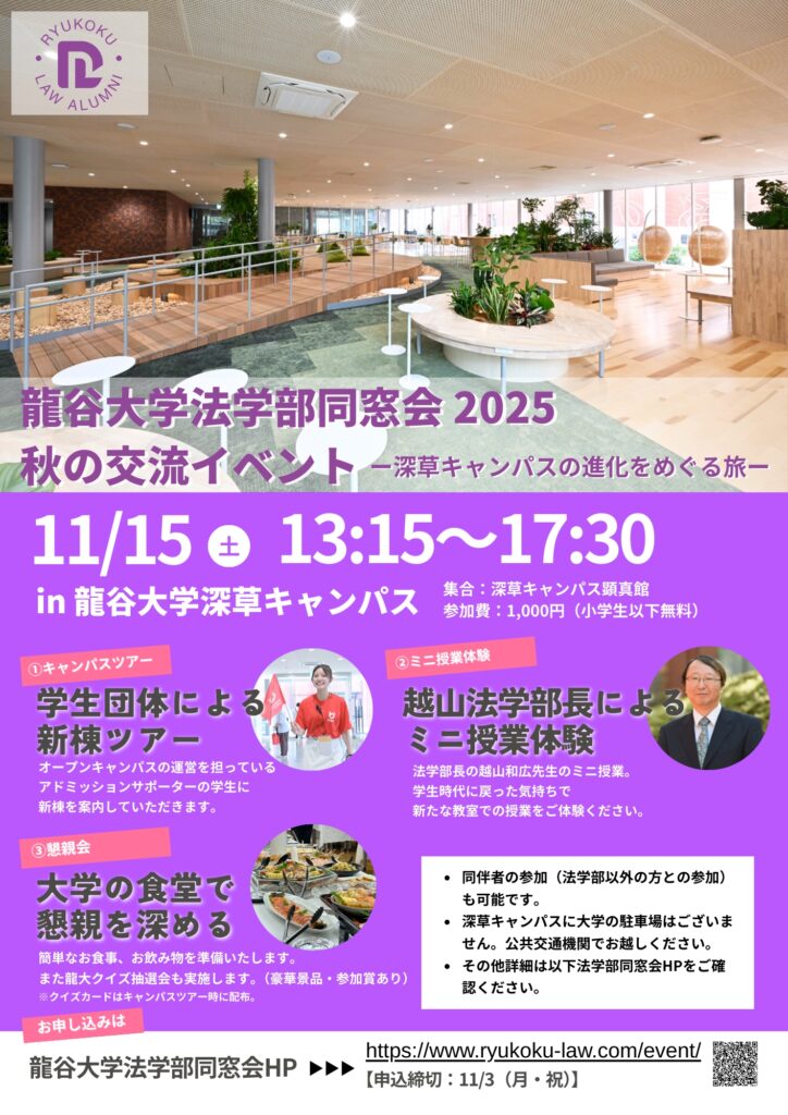 2025年09月15日/「⿓⾕⼤学法学部同窓会秋の交流イベント−深草キャンパスの進化をめぐる旅―」のご案内